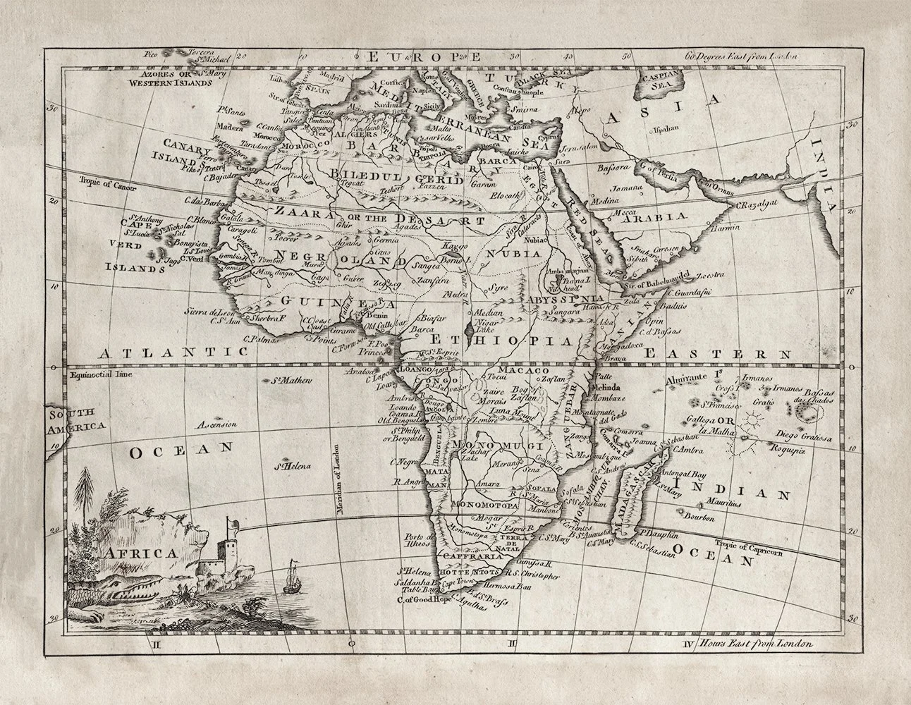 This beautifully detailed 18th-century map of Africa showcases the continent as understood during the Age of Exploration, featuring historic regional names like Negroland, Barbary, and Abyssinia. The elegant engraving style includes decorative elements such as a vignette with a lighthouse and sailing ship. Perfect for history enthusiasts, cartography collectors, or anyone seeking a sophisticated vintage aesthetic for their space.