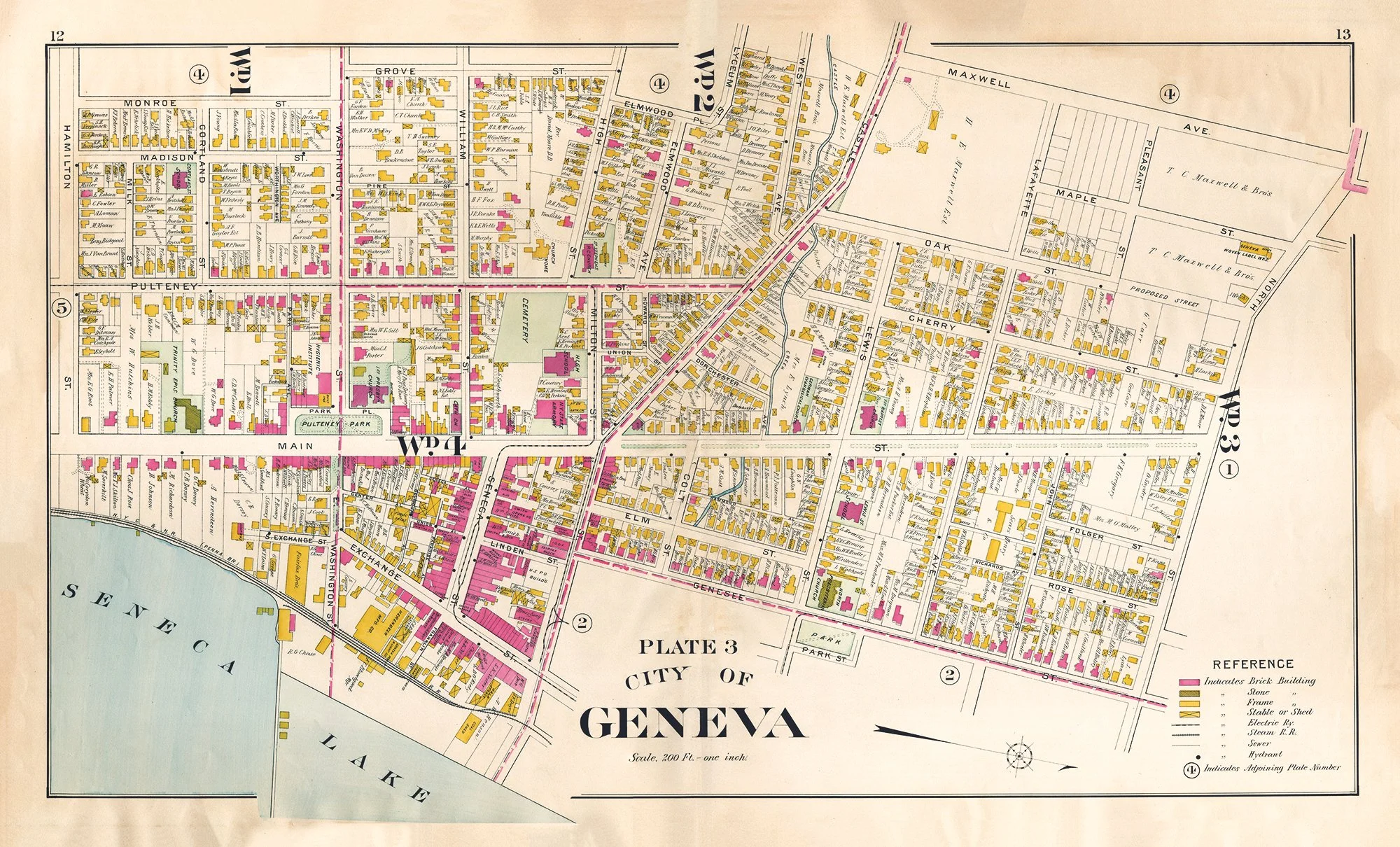 This beautifully detailed vintage map showcases the City of Geneva, New York, featuring Seneca Lake's shoreline and the carefully plotted street grid of Wards 1-4. The charming color-coded reference system highlights brick, stone, and frame buildings in pink and yellow, offering a fascinating glimpse into early 20th century urban planning. Perfect for history enthusiasts, Geneva natives, or anyone who appreciates the artistry of antique cartography.