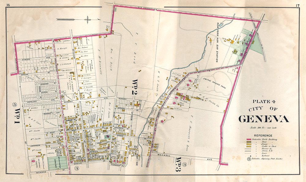 This beautifully detailed vintage map showcases the City of Geneva, New York, featuring ward divisions, property owner names, and notable landmarks including Smith's Private Park and the New York Agricultural Experiment Station. The hand-colored lithograph displays the characteristic style of 19th-century American city atlases with its precise lot divisions and elegant typography. Perfect for history enthusiasts, Geneva residents, or anyone appreciating the artistry of Victorian-era cartography.