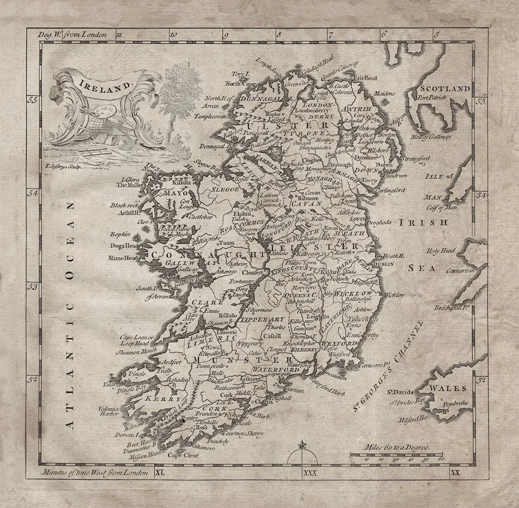 This elegant 18th-century engraved map showcases Ireland in exquisite detail, featuring the four historic provinces of Ulster, Leinster, Munster, and Connaught along with their counties and major towns. Engraved by T. Jefferys, it includes a decorative baroque cartouche and shows geographical features, coastal details, and neighboring Scotland and Wales. A stunning piece for history enthusiasts, those with Irish heritage, or anyone who appreciates fine antique cartography.