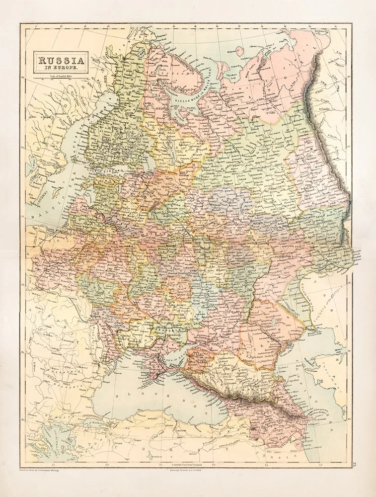 This beautifully detailed Victorian-era map depicts Russia's European territories with elegant hand-colored regions and intricate geographical detail. Published in the 19th century, it showcases the vast Russian Empire including Finland, the Baltic states, and territories extending to the Black Sea and Caucasus. A stunning piece for history enthusiasts, map collectors, or anyone seeking sophisticated vintage wall decor.
