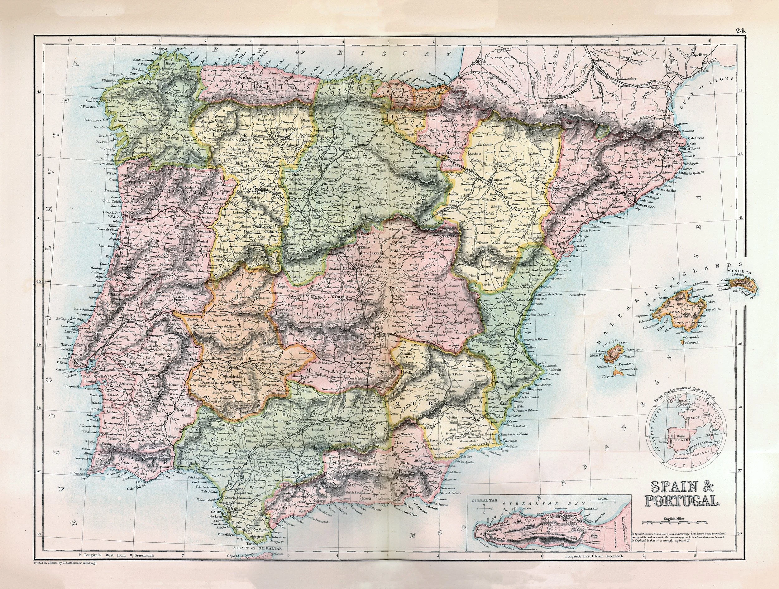 This beautifully detailed Victorian-era map showcases the Iberian Peninsula, featuring Spain and Portugal with their historic provincial boundaries. The delicate hand-tinted coloring and intricate topographical details, including an inset of Gibraltar and the Balearic Islands, exemplify 19th-century cartographic artistry. Perfect for history enthusiasts, travelers, or anyone seeking elegant vintage décor with European charm.