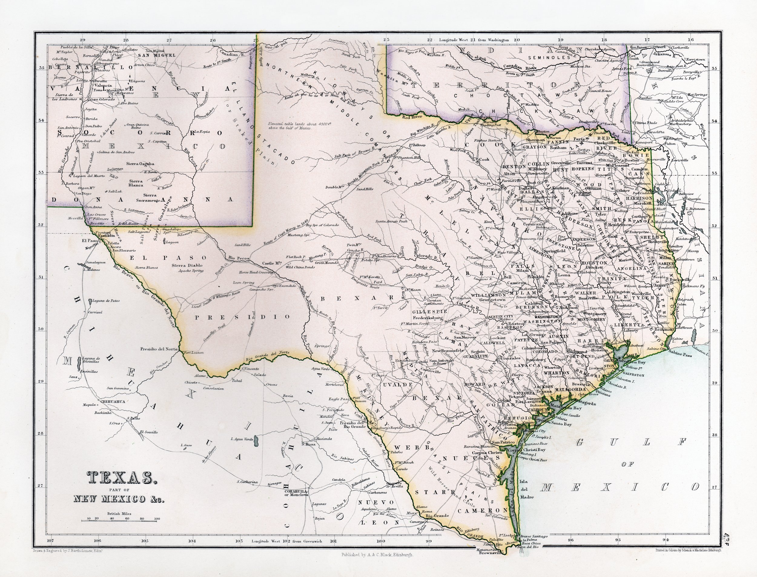 This beautifully detailed vintage map showcases Texas and portions of New Mexico as they appeared in the mid-1800s, published by A. & C. Black of Edinburgh. The hand-colored counties, geographic features, and early settlements offer a fascinating glimpse into the region's territorial history. Perfect for Texas history enthusiasts, collectors of antique cartography, or anyone seeking distinguished wall art with historical significance.