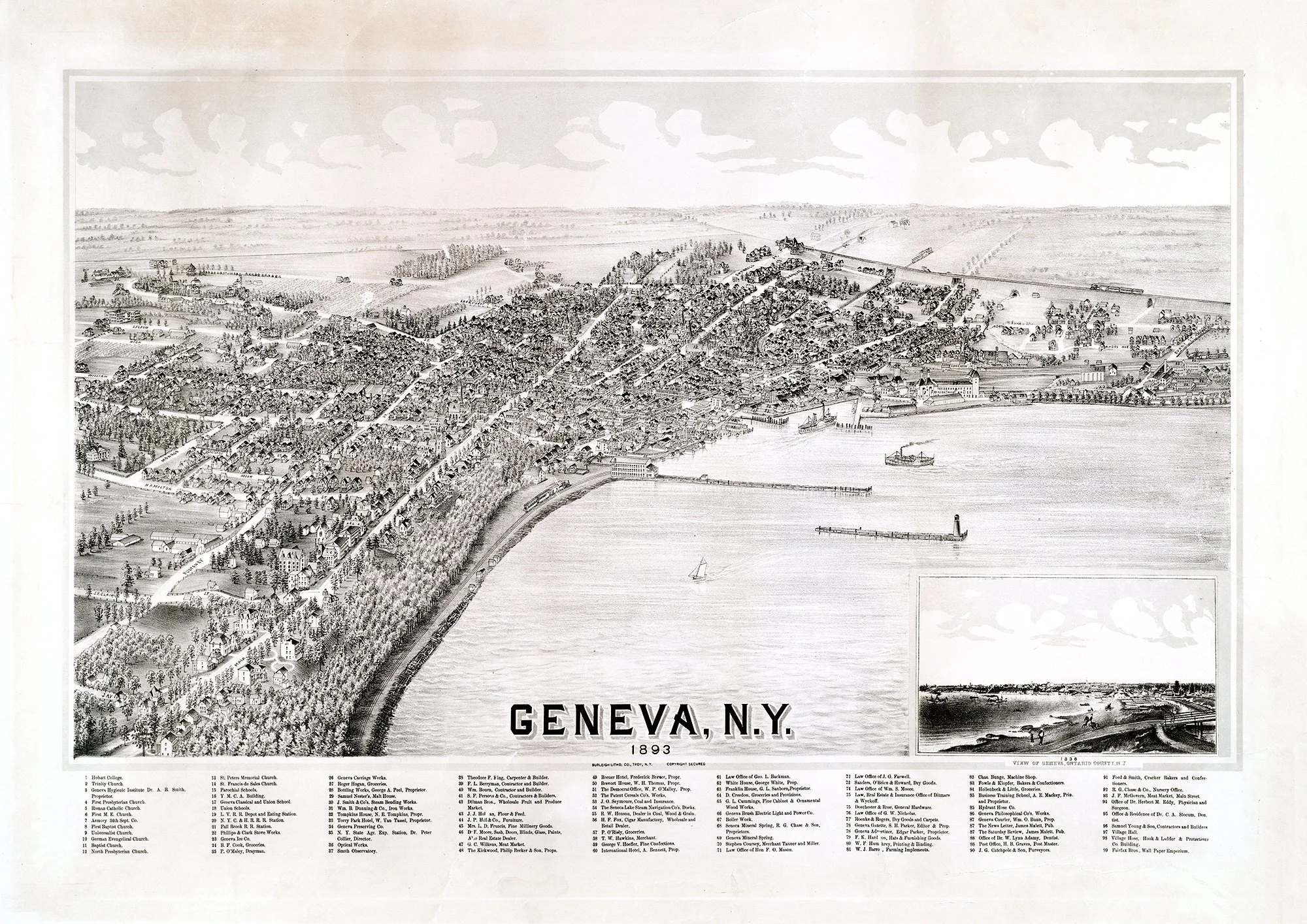 This stunning panoramic bird's eye view captures Geneva, New York in 1893, showcasing the charming lakeside town along Seneca Lake with remarkable detail. The lithograph reveals tree-lined streets, Victorian architecture, and the bustling waterfront that defined this Finger Lakes community during the Gilded Age. A beautiful piece of Americana that makes an elegant addition to any home, office, or perfect gift for those with ties to the region.