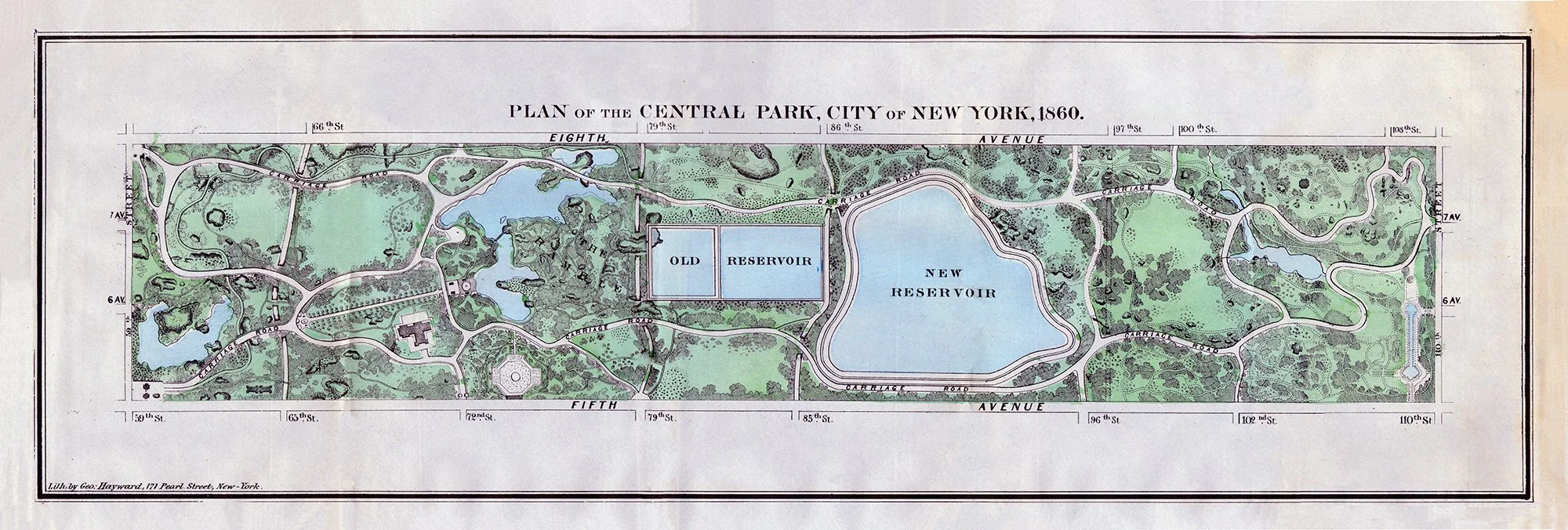 This stunning 1860 lithograph showcases the original master plan of Central Park, featuring the historic Old and New Reservoirs surrounded by winding carriage roads and lush greenery. Lithographed by Geo. Hayward of Pearl Street, New York, this detailed bird's-eye view captures Frederick Law Olmsted and Calvert Vaux's groundbreaking landscape design in exquisite detail. A must-have for NYC history enthusiasts, architecture lovers, and anyone who appreciates vintage cartography.
