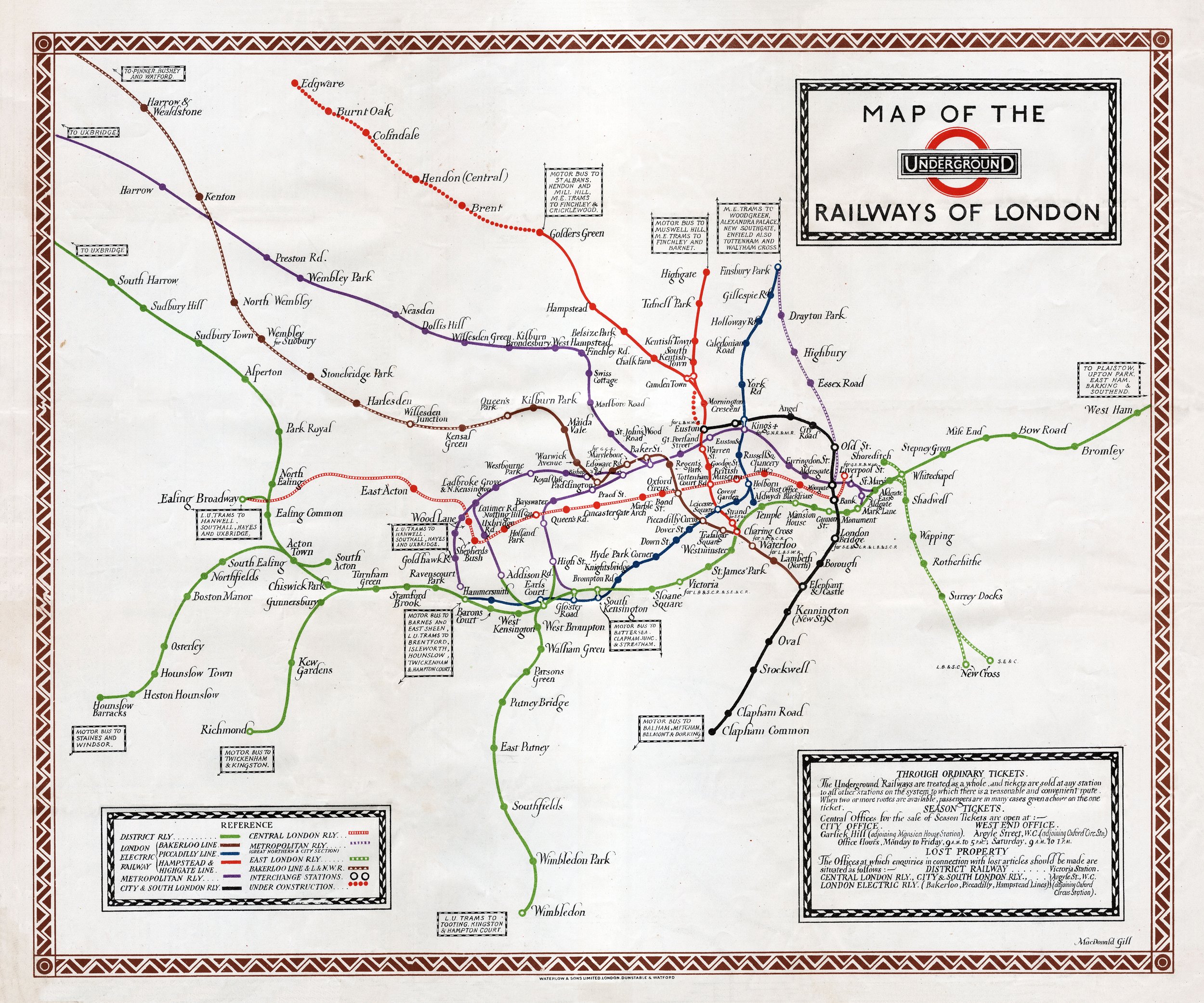 This beautifully preserved early London Underground map showcases the iconic transit system before Harry Beck's revolutionary 1931 redesign, featuring geographically accurate rail lines across the capital. The elegant typography, decorative border, and classic color-coded routes capture the charm of early 20th century British design. A perfect piece for transportation enthusiasts, Anglophiles, and lovers of vintage cartography.