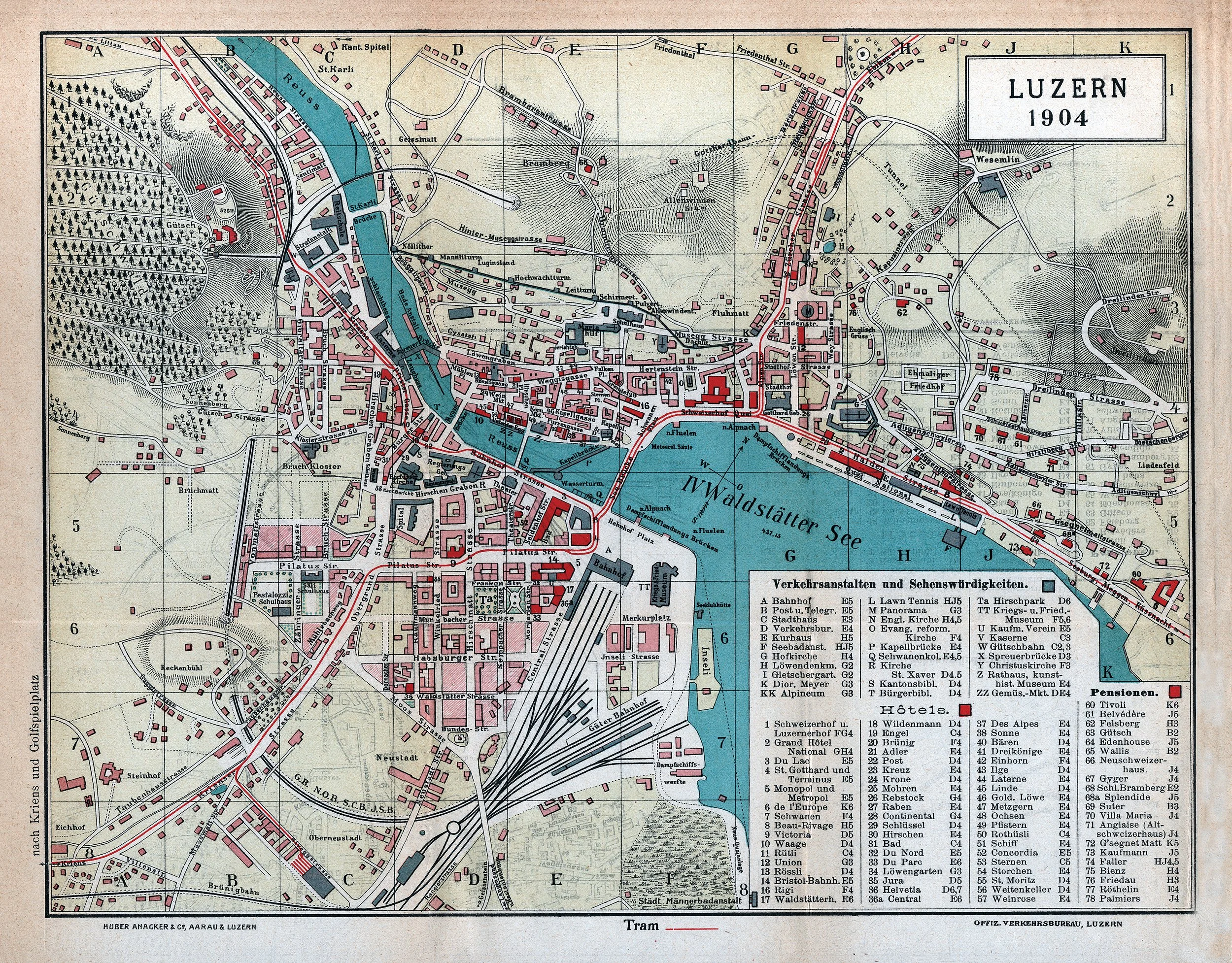 This beautifully detailed 1904 map of Luzern (Lucerne), Switzerland showcases the historic Swiss city at the turn of the century, complete with the iconic Vierwaldstätter See (Lake Lucerne). The map features intricate street layouts, topographical details, and a comprehensive legend of hotels, landmarks, and points of interest in German. A stunning piece for lovers of Swiss history, vintage cartography, or anyone with a connection to this picturesque Alpine destination.