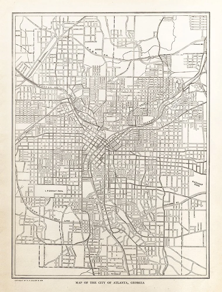 This detailed antique street map of Atlanta, Georgia showcases the city's urban layout from the early 20th century, published by P.F. Collier & Son. The intricate grid of streets, railways, and notable landmarks like Grant Park and Piedmont Park are beautifully rendered in classic cartographic style. A perfect addition for Atlanta natives, history enthusiasts, or anyone who appreciates vintage American cartography.