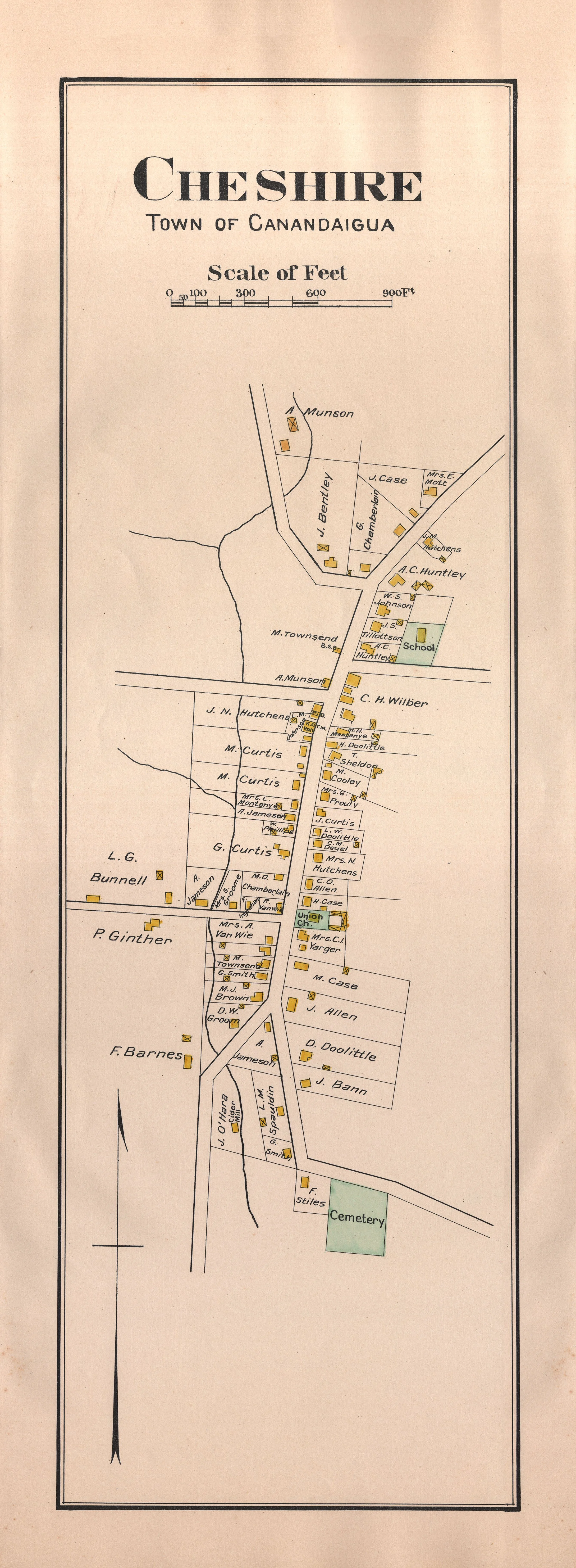This charming historical map depicts the hamlet of Cheshire in the Town of Canandaigua, New York, showing individual property owners and landmarks including a school and cemetery. The hand-colored cadastral map features delicate yellow, orange, and green highlights marking buildings and plots along the main thoroughfare. A wonderful piece for history enthusiasts, genealogy researchers, or anyone with roots in Ontario County's Finger Lakes region.