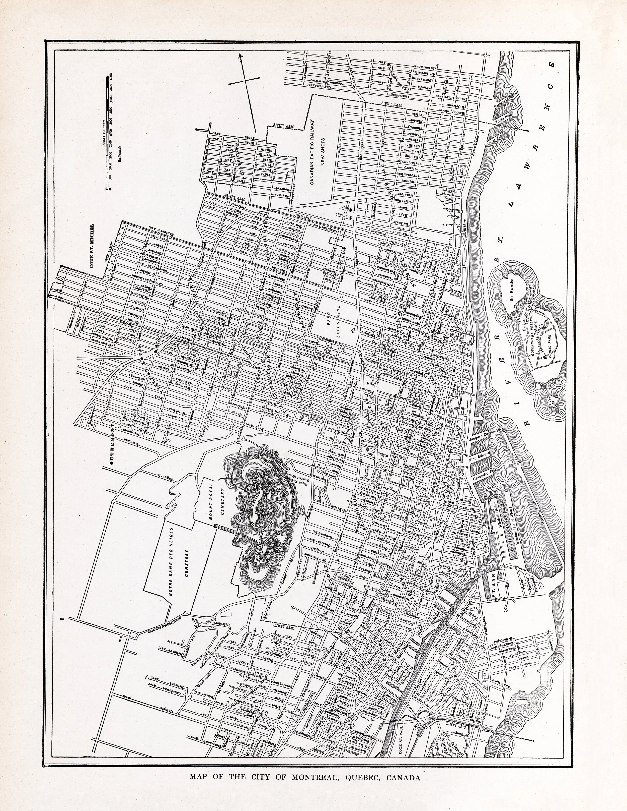 This detailed antique map showcases Montreal's historic street layout, featuring Mount Royal Cemetery at its center and the St. Lawrence River along the eastern edge. The fine line work and classic cartographic style capture the city's urban development during the late 19th or early 20th century. Perfect for history enthusiasts, Montreal natives, or anyone who appreciates vintage cartography as elegant wall decor.