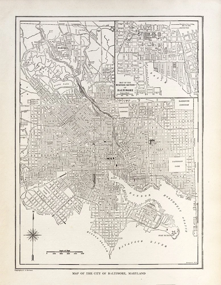 This detailed antique map showcases Baltimore, Maryland in stunning cartographic detail, featuring the city's street grid, harbor, and notable landmarks including Fort McHenry and Patterson Park. The elegant black and white engraving includes an inset of the business district and captures the city's layout from the late 19th century. Perfect for history enthusiasts, Baltimore natives, or anyone who appreciates vintage cartography and timeless wall decor.