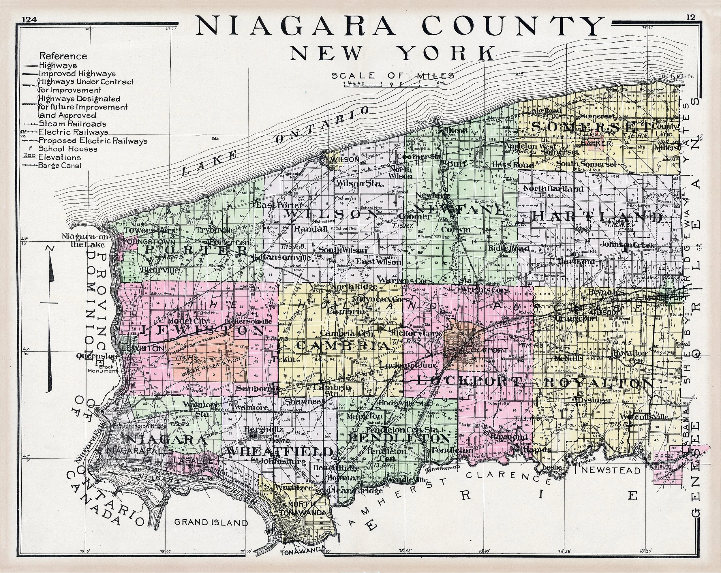 This beautifully detailed antique map showcases Niagara County, New York, featuring the townships of Lewiston, Porter, Wilson, Lockport, and the famous Niagara Falls region. The soft pastel coloring highlights each township boundary while intricate details show railways, highways, schools, and elevations along Lake Ontario's southern shore. A stunning piece for history enthusiasts, New York natives, or anyone who appreciates classic American cartography.