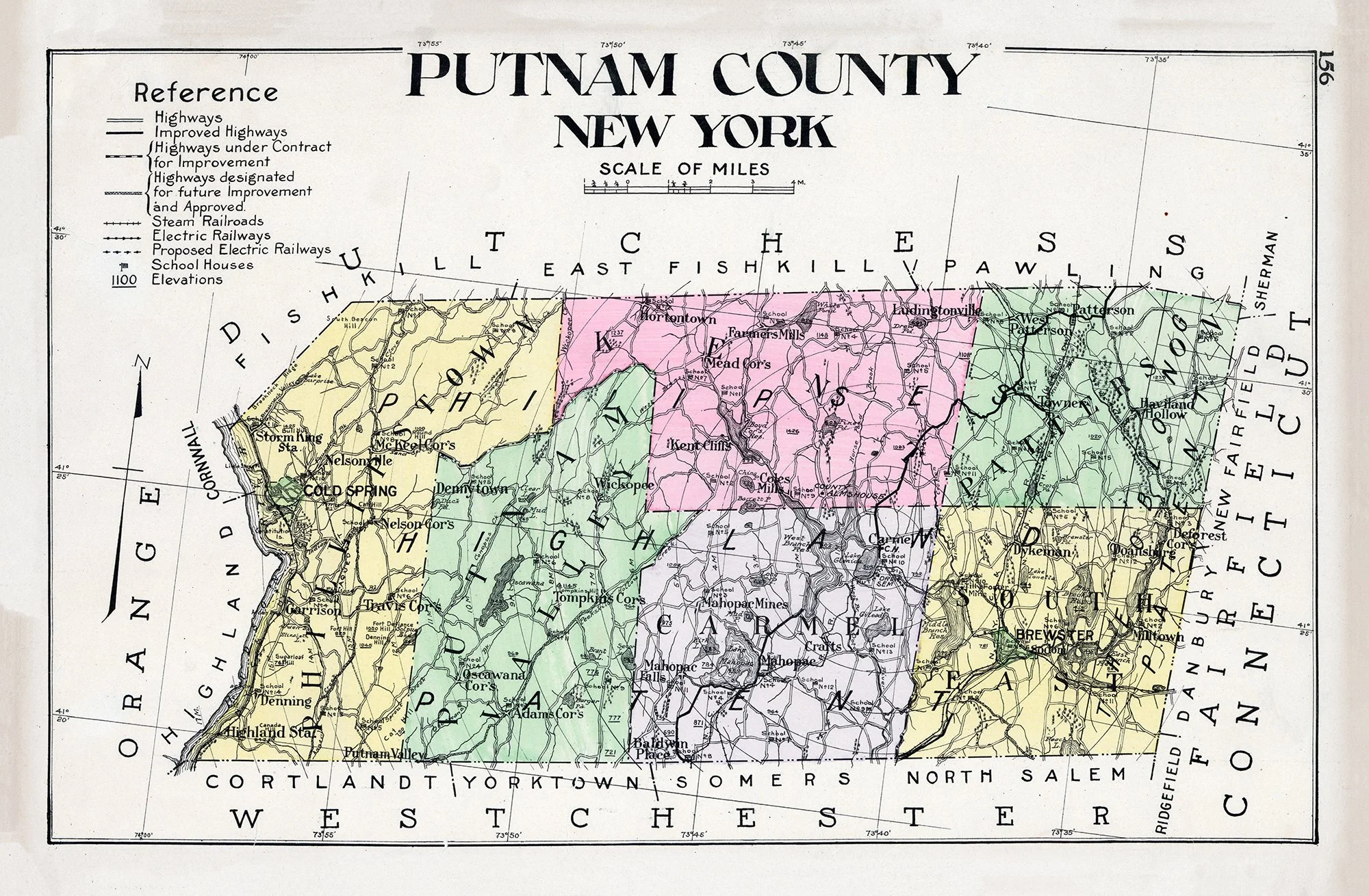 This beautifully detailed antique map showcases Putnam County, New York with its townships distinctly color-coded in soft pastels. Featuring highways, railways, elevations, and historic village names, this cartographic treasure captures the region's geography from the early 1900s. Perfect for history enthusiasts, local residents, or anyone with Hudson Valley roots seeking meaningful wall décor.